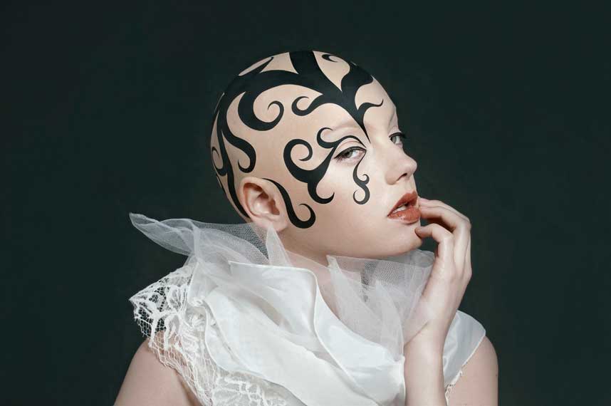 STUDENT COMMENT: This shoot was a collaboration between the make-up artist and myself. We both wanted to work on a illustrative bald cap design together and came up with a design we were both happy with. The image also features in my 2011 folio for commercial.