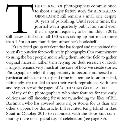 For the most recent edition of Australian Geographic he travelled to King Island to revisit a feature he shot in 2009. The accompanying excerpt from “Every Picture Tells a Story: 30 Years of AG Photography” by editor-in-chief Chrissie Goldrick makes note of Bill’s special relationship with the magazine. We’re delighted to have Bill as a key member of the PSC teaching team!